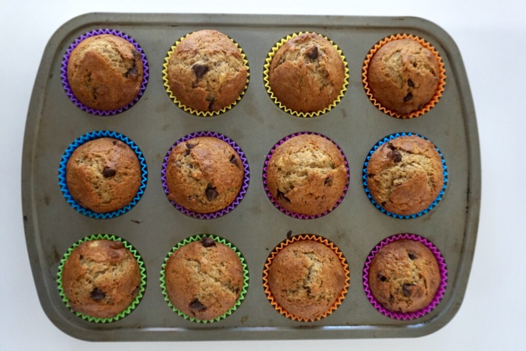Bananas are just one of those foods that if it’s not consumed within X days, it’s a lost cause, and unfortunately for me, the smell of overripe bananas makes me gag. However, super overripe bananas happen to make excellent muffins. So here’s a relatively quick and easy recipe for when you find yourself staring at a bunch of bananas with more brown than yellow, as I was this morning.