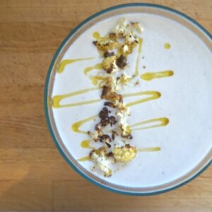 This is a really great recipe to use for a dinner party, it serves 6-8 people, is dairy-free, rich yet feels light, and it’s delicious. It can also be jazzed up to look like it came out of a restaurant. It’s all about reserving some crispy cauliflower at the end, and getting a good drizzle of olive oil as a topping.