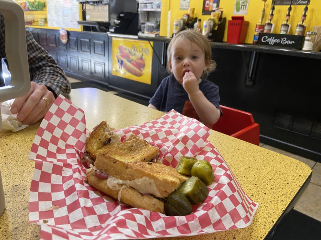 We decided to skip baby gym this morning, the baby really needed the nap with the time change. My husband worked from home today, so the three of us decided to go try the deli around the corner (it’s been around since the 1960s). It was absolutely fantastic – we each got a sandwich and shared a bag of chips ($35 with tip), 10/10 we will be back. Excellent lunch spot! We walked around the neighborhood afterwards, and grabbed an iced latte, it was such a wonderful afternoon.