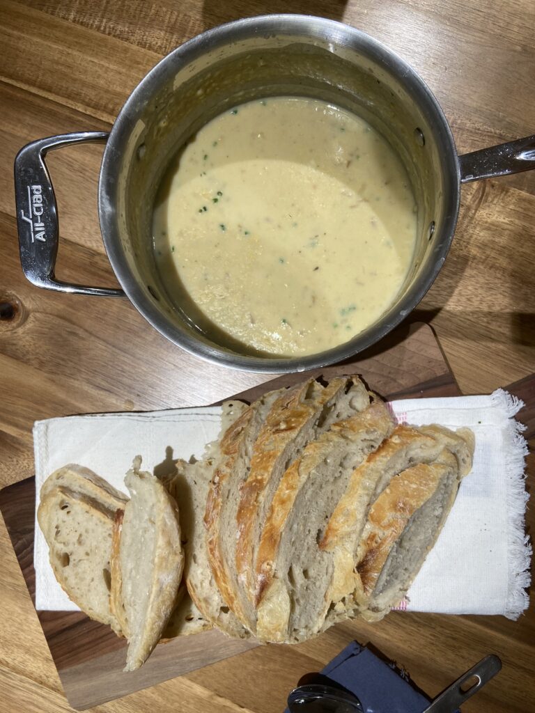 I decided to make the corn chowder and homemade bread that I earmarked for Thursday night. I also made a batch of maple-whiskey sours, since we had friends and family over, plus it was our first night lighting a fire in our new fireplace. We made s’mores for dessert, it was really fun.When we approach the $200 mark for weekly groceries, it’s definitely panic inducing, but I have to remind myself that this money covers nearly all of the 21 meals each week (breakfasts, lunches, and dinners), plus snacks and beverages for two adults and three toddlers. Even if you take out the toddlers, $200 for two adults for nearly 21 meals breaks down to $5 per person, per meal, and that’s including coffee, wine, snacks, etc. It’s really not that bad when you look at it that way!
