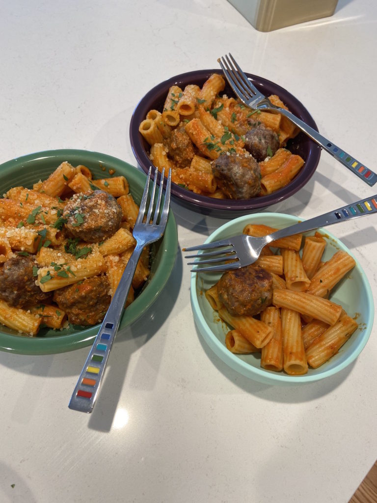 Meatballs, pasta, and homemade vodka sauce. Yum! Though the toddler wanted none of it and screamed the entire time we ate.