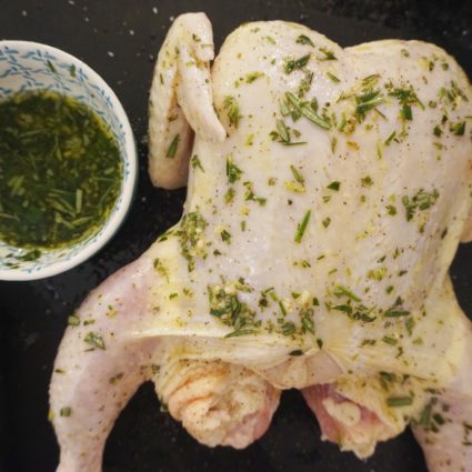 - With chicken breast side down, use kitchen shears to cut through bones on either side of backbone; discard backbone. Flip chicken over, tuck wingtips behind back, and press firmly on breastbone to flatten. Pat chicken dry with paper towels, then rub with olive oil-rosemary-garlic mixture and season with salt and pepper.