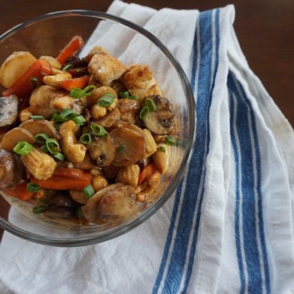 - Add mushrooms, carrots, corn, and water chestnuts to pan and sauté. Season with salt and pepper. Add cooked chicken, cashews, and stir-fry sauce. Stir well and cover for about 3 minutes.