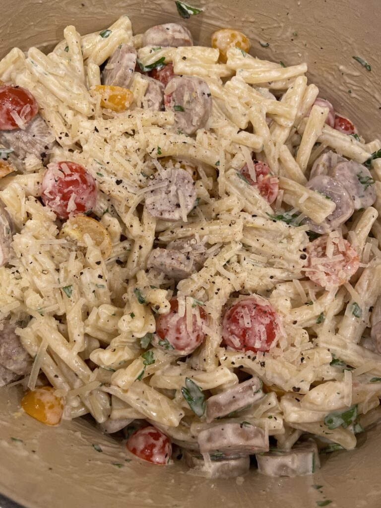 - Reserve ¾ cup pasta cooking water and add to cream sauce. Return sauce to medium heat. Using tongs, transfer pasta to sauce and cook, tossing often and adding Parmesan a little at a time, until sauce is creamy, about 3 minutes. If sauce looks tight, add 1–2 tablespoons more pasta cooking liquid. (Cream sauces tighten as they cool, so lean on the saucy side.) Stir in reserved lemon juice; season with salt and pepper to taste. Add in tomatoes and sausage, garnish with parsley.