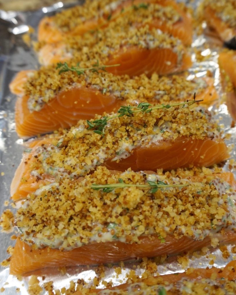 This particular herb crusted salmon calls for a base of mustard, mayo, and tarragon, topped with a mixture of thyme and panko breadcrumbs as the crust. Talk about a flavor explosion!