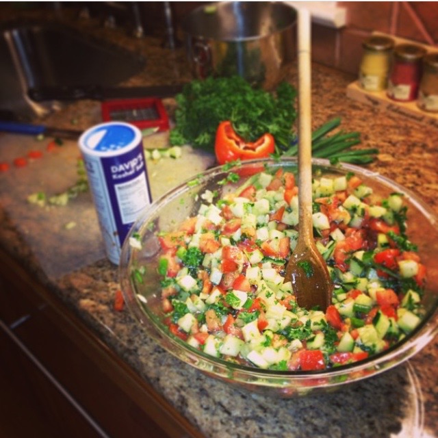 The combination of tomatoes, cucumbers, lemon juice, mint, and salt cannot be beat. Seeing how that’s the foundation of this E-A-S-Y Israeli salad makes it an automatic winner in my book. It’ll take you less than 15 minutes from start to finish, and it’s a one bowl recipe. Do you need any more reasons to make this? Note: when selecting salt, always, always, always use Kosher salt for Israeli salad. And feel free to use it liberally…