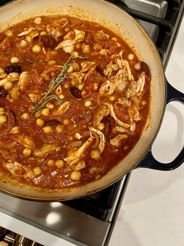 Sign me up for anything with a tomato-based sauce. Seriously. Now add chickpeas, onions, chicken, and kalamata olives and you have me coming back for seconds. Possibly even thirds.