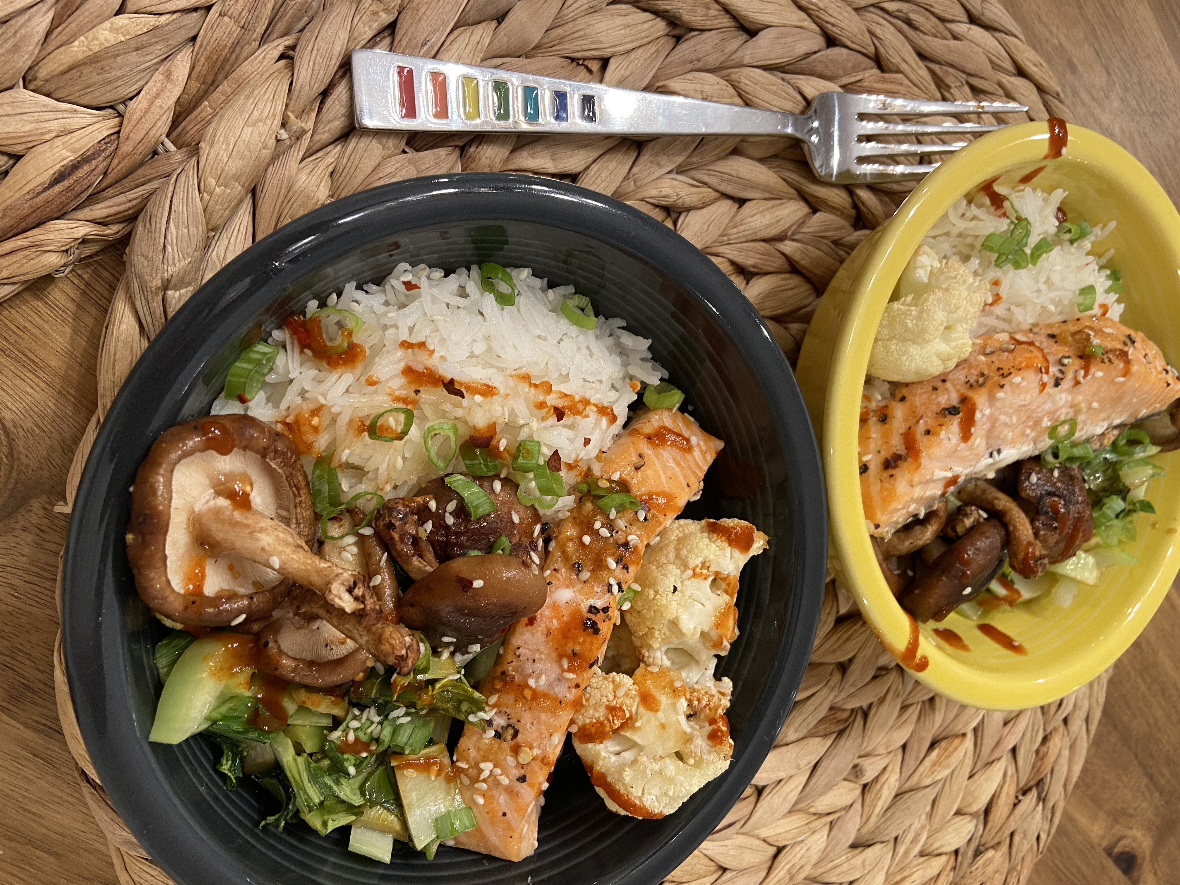 - Arrange a bowl with rice of your choosing, arrange salmon, vegetables, and sprinkle the bowl with sesame seeds, scallions, and chili flakes or sriracha for heat.