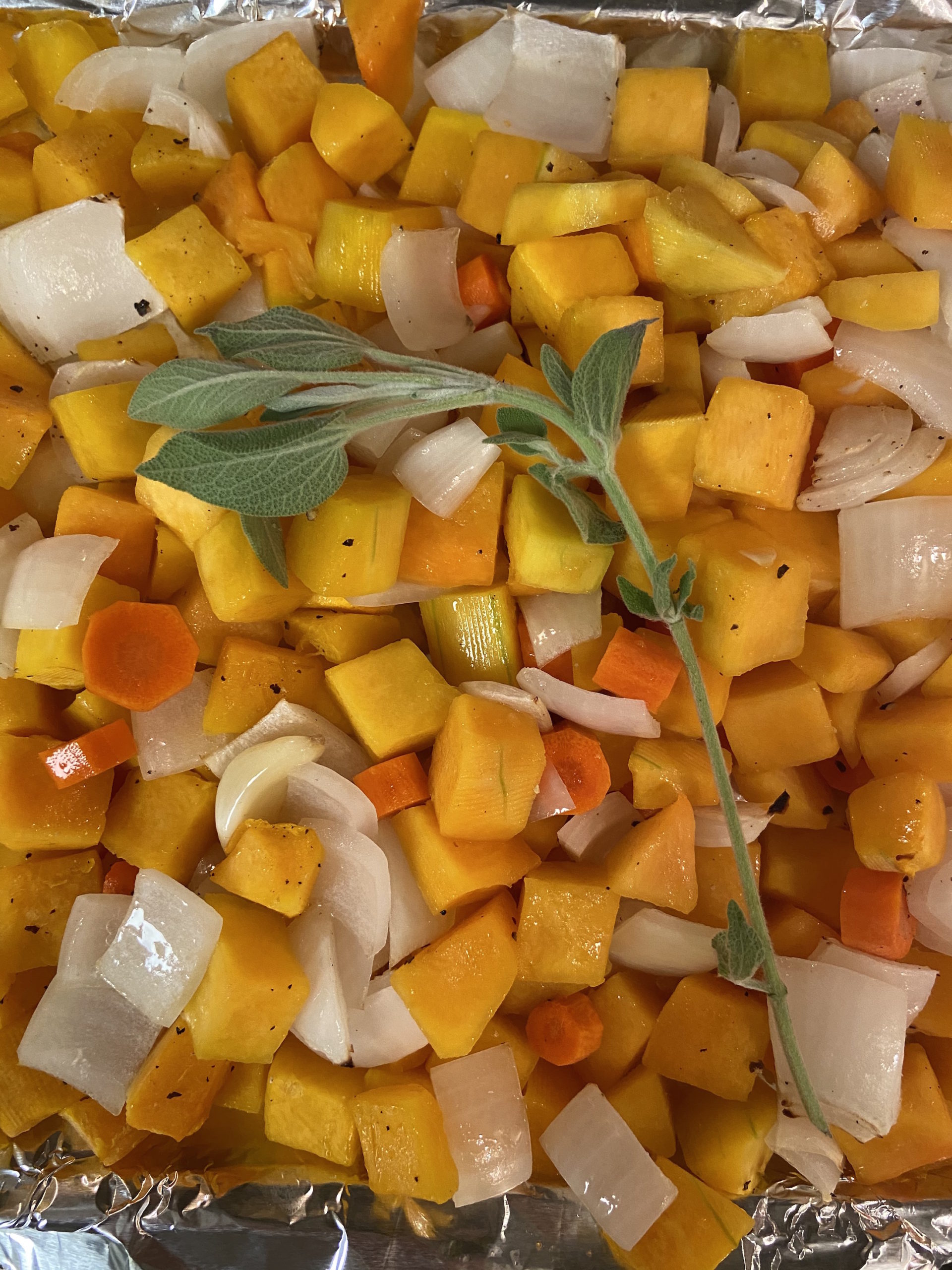 - Preheat oven to 400 degrees. Line a baking sheet with tin foil. In a large bowl, mix together carrot, white onion, butternut squash, and garlic clove. Add in coconut oil, stir well to combine. Season with salt and pepper. Roast in oven for 20-25 minutes.